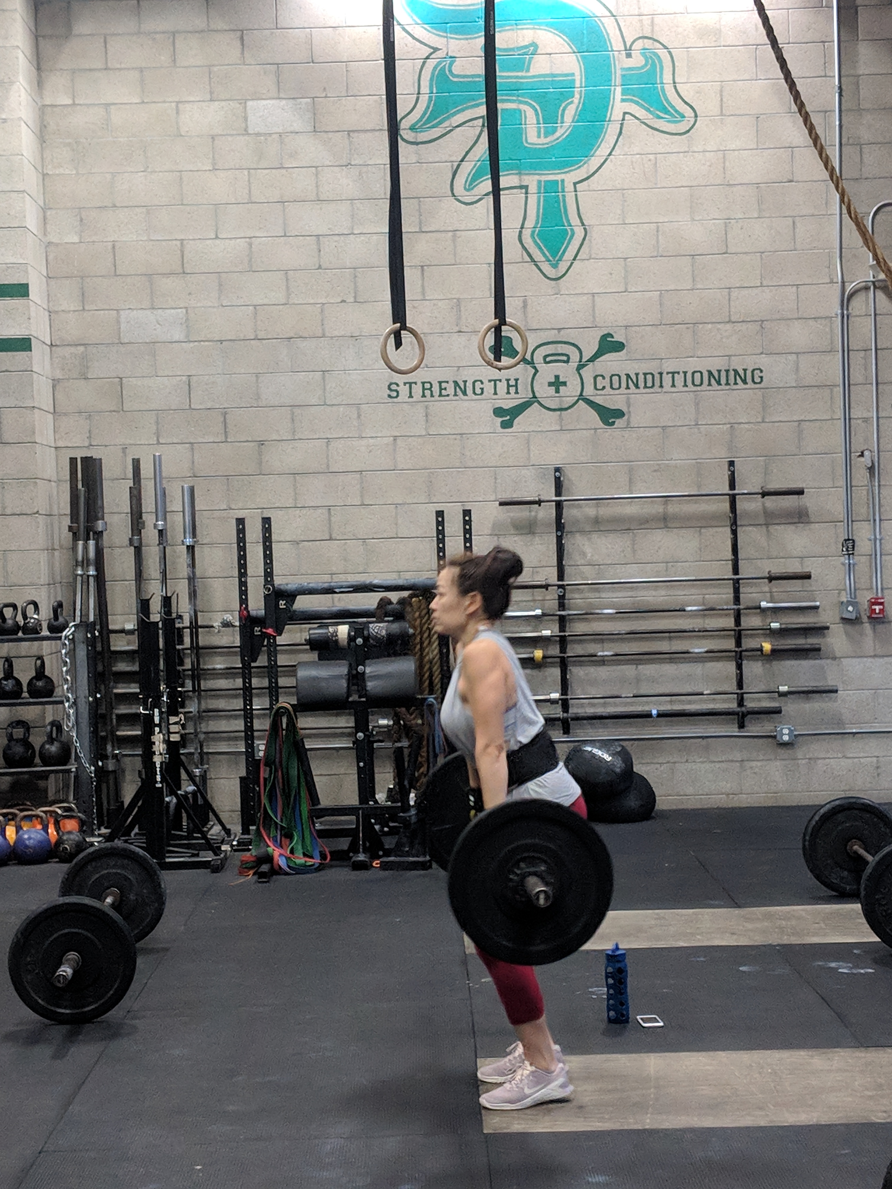 Q: What was your first session at CrossFit like?A: I remember showing up really early to the class because I was super excited to be there. Jeremiah coached my intro class with two other people. I struggled with the body weight exercises – turns out, it’s difficult to do push-ups and pull-ups carrying around extra baggage. But I stuck with it on the scaled versions. I finished the workout several minutes after the other two people, but I was okay with that. I pushed myself and did the best I could. Exhausted and with soreness setting in, I knew this was where I wanted to be.